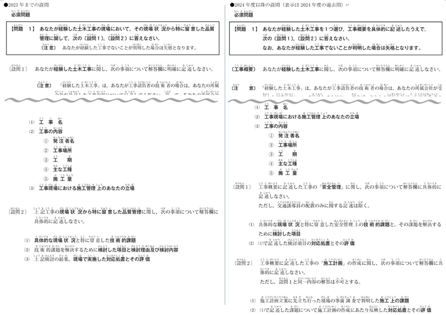見直し後の設問(上図の右側)は2024年度のものですが、2025年度の〔設問2〕では、「環境対策」が問題条件となり出題されています。また、課題については、2024年度「施工上の課題」という題意だったものが、2025年度は「技術的な課題」に変化しています。「技術的な・・」ということは、環境保全(騒音振動など)上や廃棄物処理について、法令上で規定されている知識に基づいた記述が要求されています。微妙な表現の違いですが、〔設問2〕については、2024年度より2025年度の方が、要求水準が上がっていると考えてください。また、出題内容にパターンは存在せず、想定外の設問となる可能性が高いという点にも留意する必要があります。